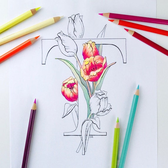 Alphabet Coloriage De Fleurs Tulipe Coloriage Lettres Coloriages De Fleurs Imprimable Pages A Colorier Pour Adultes Floral Lettre T