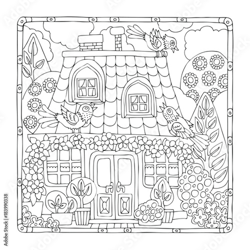 Hand Drawn Fairy House With Birds In Frame Sketch For Anti